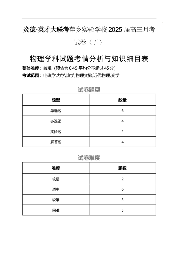 江西省萍乡市萍乡实验2025届高三上学期月考卷(五)物理细目表
