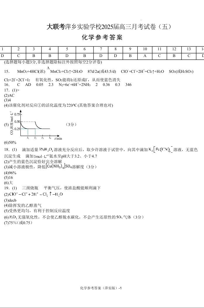 江西省萍乡市萍乡实验2025届高三上学期月考卷(五)化学答案