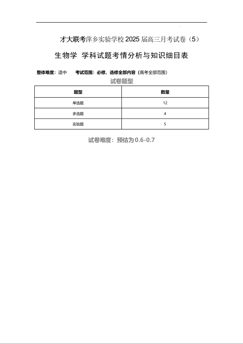 江西省萍乡市萍乡实验2025届高三上学期月考卷(五)生物细目表