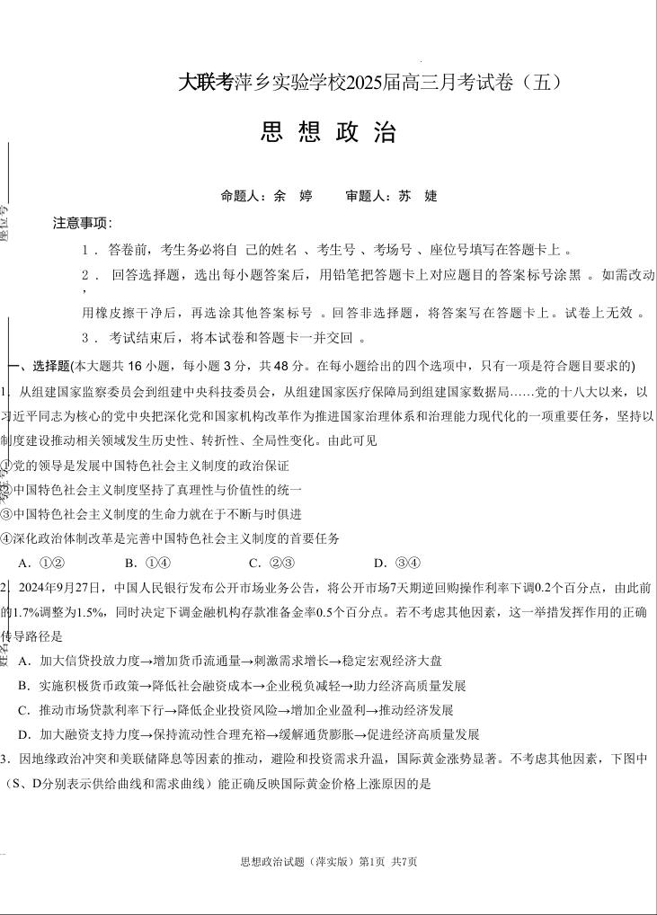 江西省萍乡市萍乡实验2025届高三上学期月考卷(五)政治
