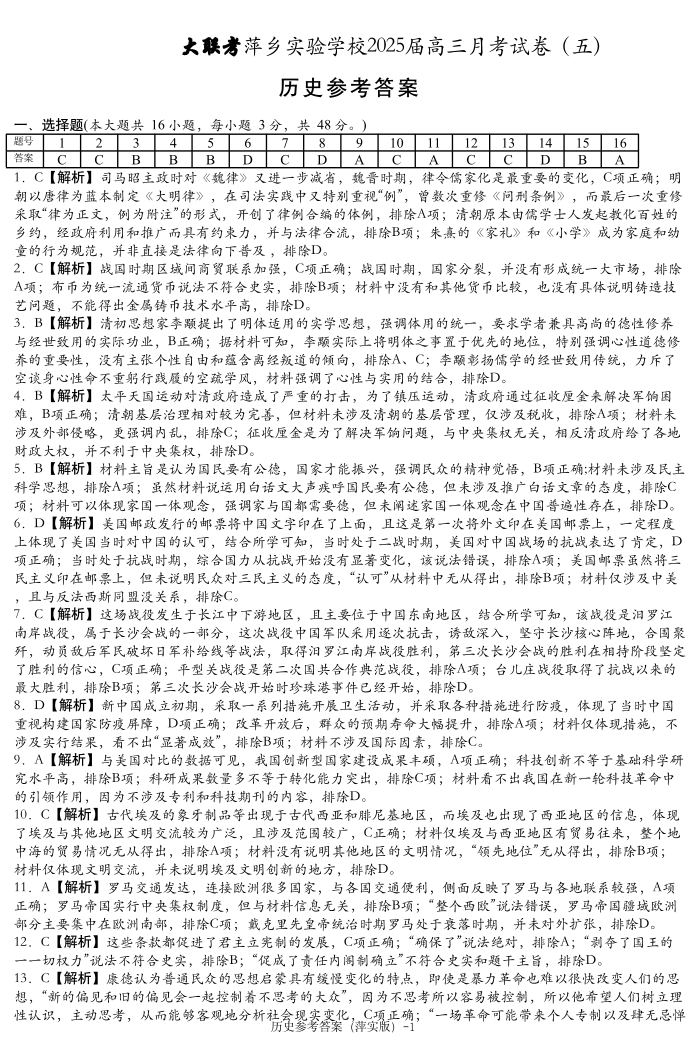 江西省萍乡市萍乡实验2025届高三上学期月考卷(五)历史答案