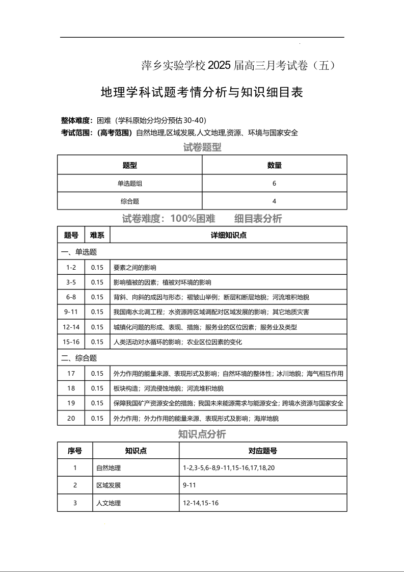 江西省萍乡市萍乡实验2025届高三上学期月考卷(五)地理细目表