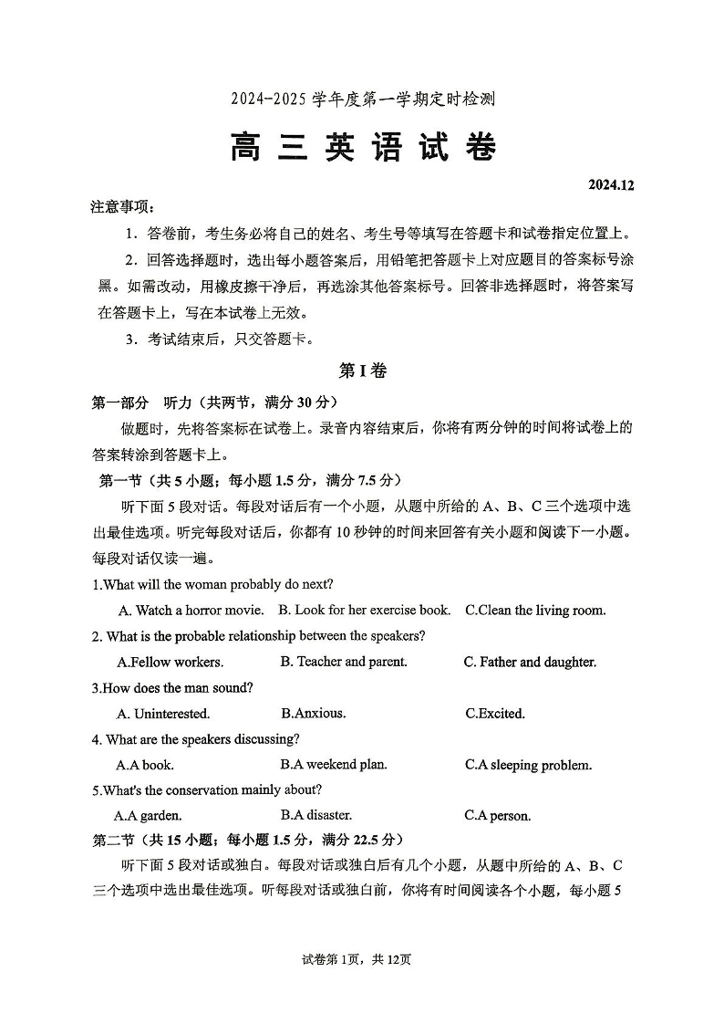山东省滕州市第一中学2025届高三上学期12月定时检测英语+答案