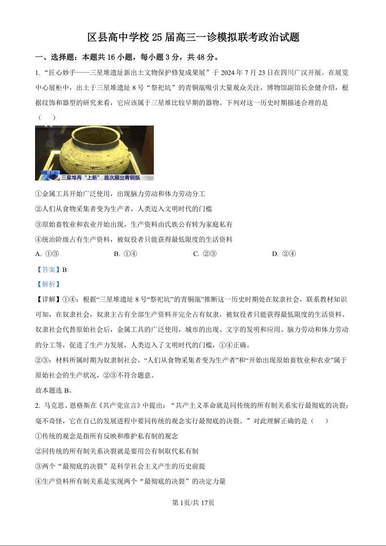 四川省眉山市区县高中2025届高三上学期12月一诊模拟联考政治(精品解析版)