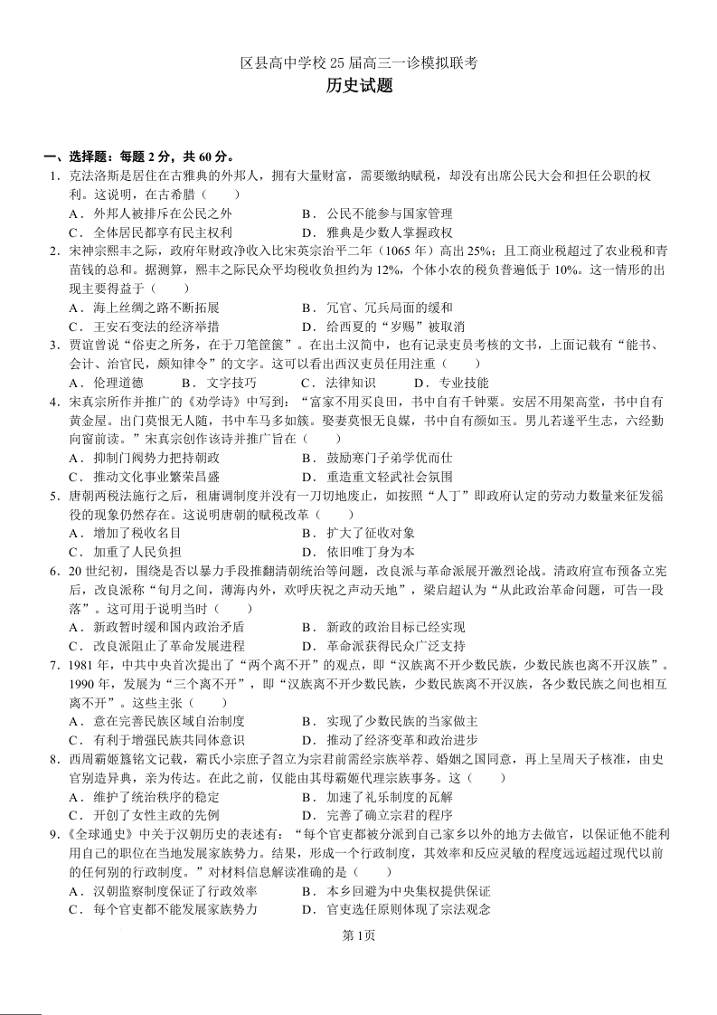 四川省眉山市区县高中2025届高三上学期12月一诊模拟联考历史+答案