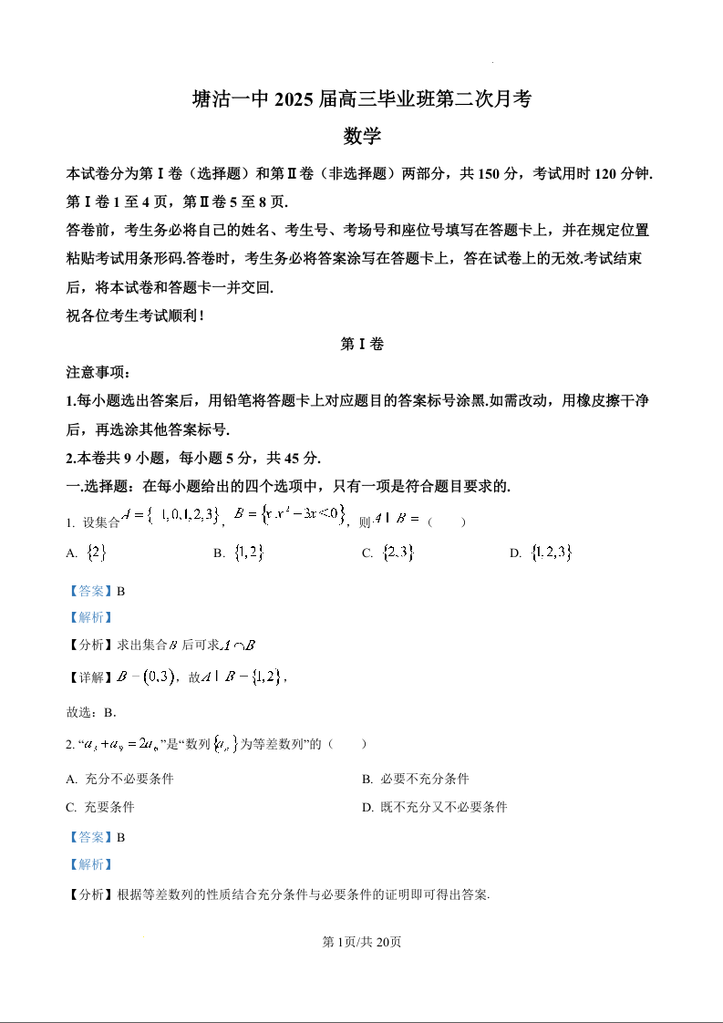天津市滨海新区塘沽第一中学2025届高三上学期第二次月考数学(精品解析版)