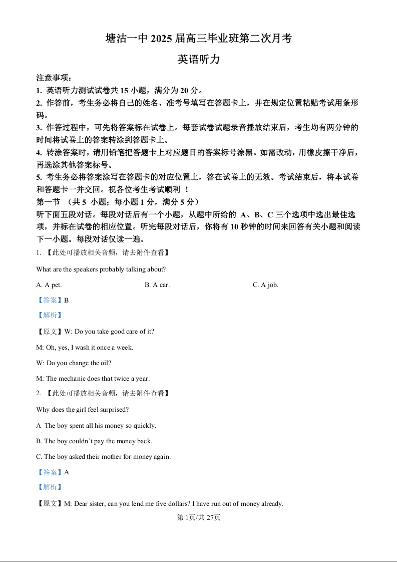 天津市滨海新区塘沽第一中学2025届高三上学期第二次月考英语(精品解析版)