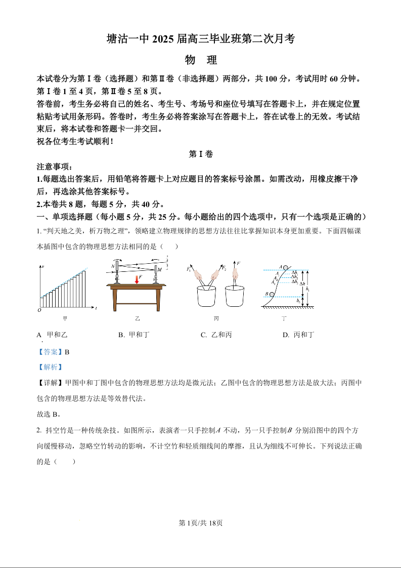 天津市滨海新区塘沽第一中学2025届高三上学期第二次月考物理(精品解析版)
