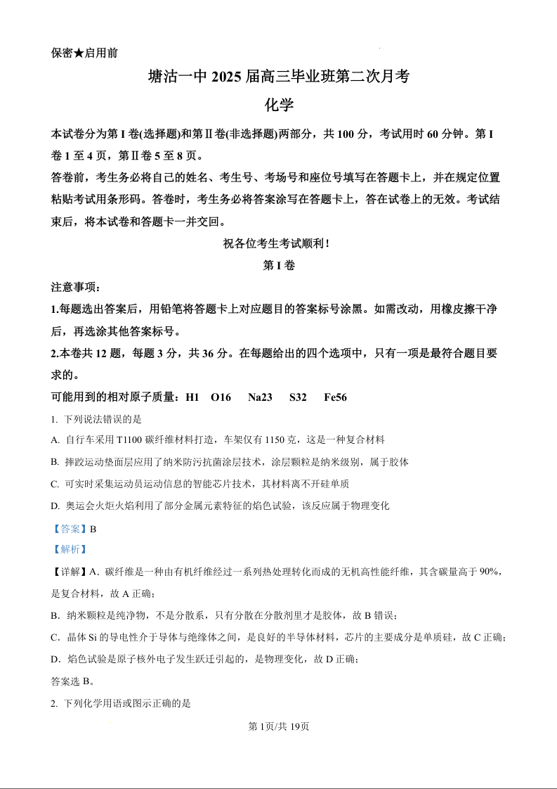 天津市滨海新区塘沽第一中学2025届高三上学期第二次月考化学(精品解析版)