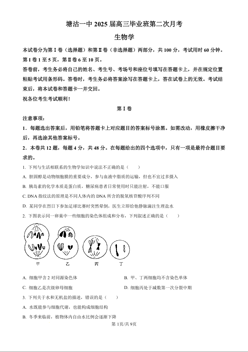 天津市滨海新区塘沽第一中学2025届高三上学期第二次月考生物学(原卷版)