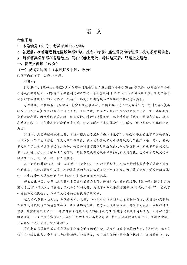 浙江省慈溪中学、舟山中学等多校2025届高三上学期期中考试语文+答案