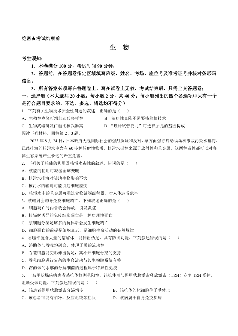 浙江省慈溪中学、舟山中学等多校2025届高三上学期期中考试生物+答案