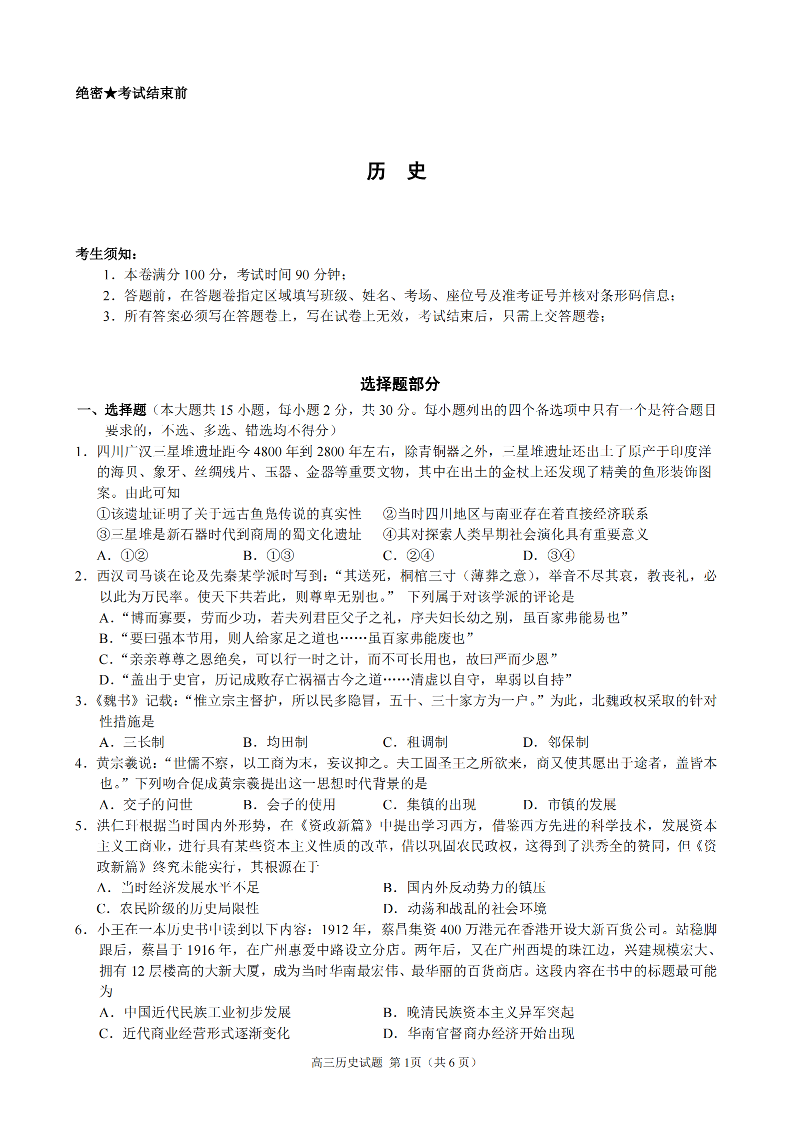 浙江省慈溪中学、舟山中学等多校2025届高三上学期期中考试历史+答案