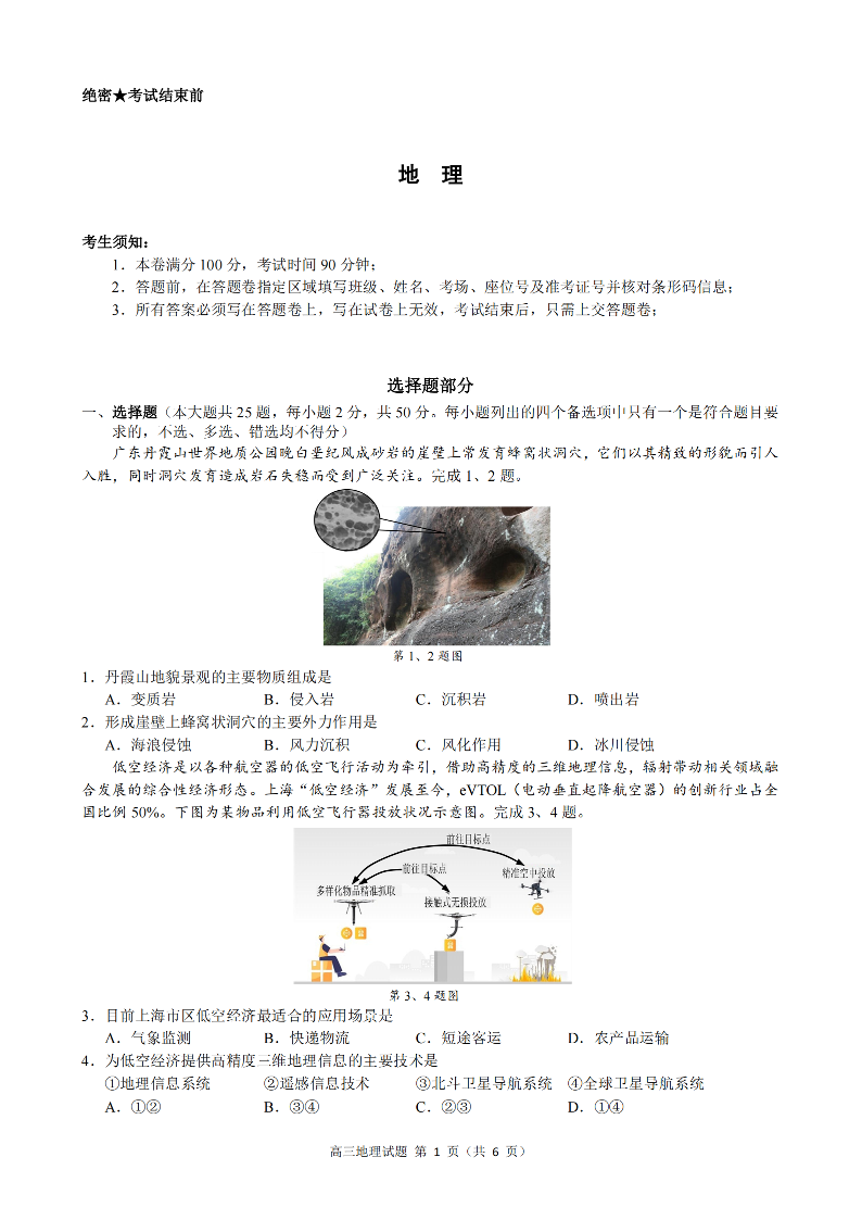 浙江省慈溪中学、舟山中学等多校2025届高三上学期期中考试地理+答案