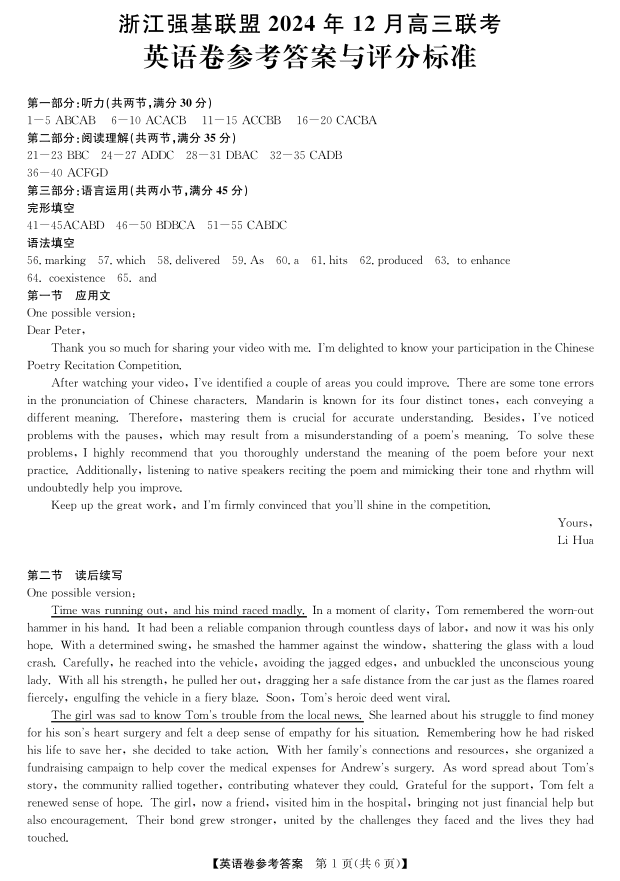 浙江省强基联盟2025届高三上学期12月联考英语答案