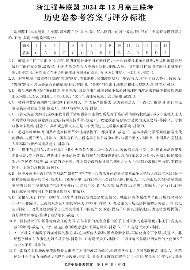浙江省强基联盟2025届高三上学期12月联考历史答案
