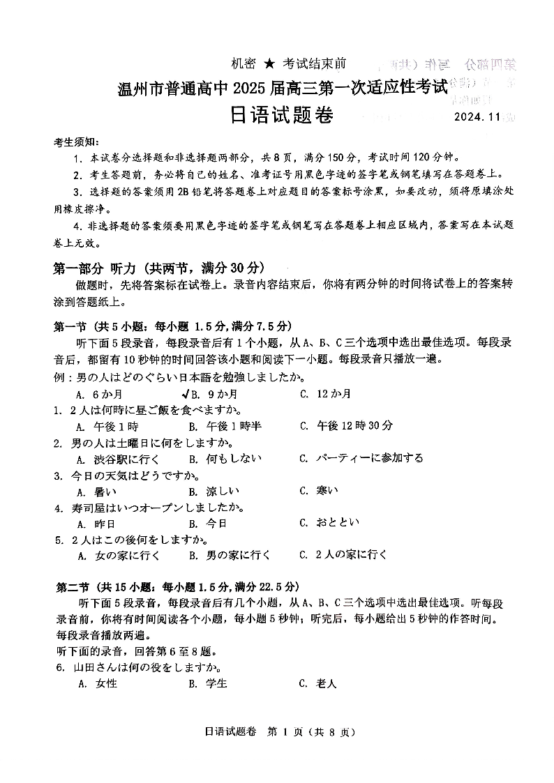 浙江省温州市高中2025届高三上学期第一次模拟考试日语