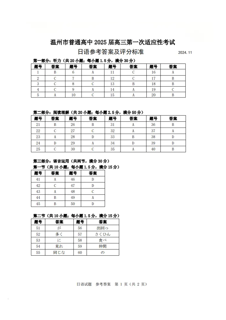 浙江省温州市高中2025届高三上学期第一次模拟考试日语答案