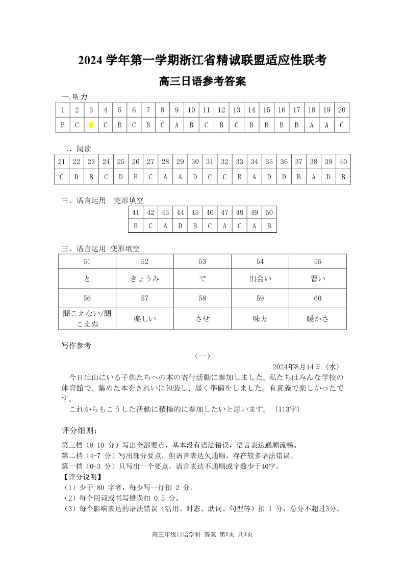 浙江省精诚联盟2025届高三上学期12月适应性联考日语答案