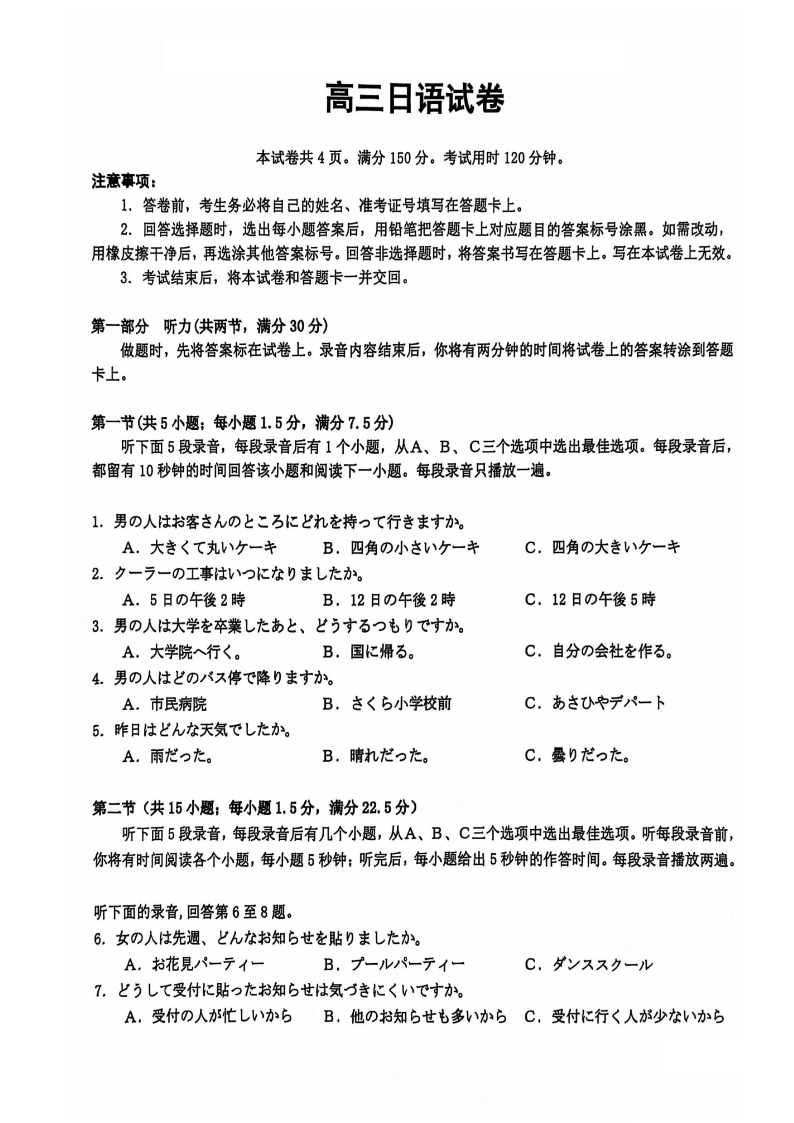 浙江省绍兴市诸暨市2024年12月高三诊断性考试试题日语