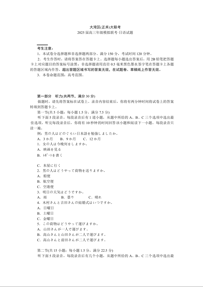 广东省大湾区(正禾)大联考2025届高三上学期12月模拟联考日语+答案