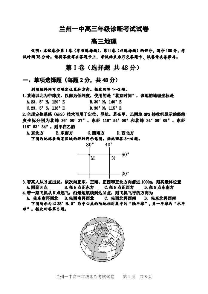 甘肃省兰州第一中学2025届高三年级诊断考试试卷地理