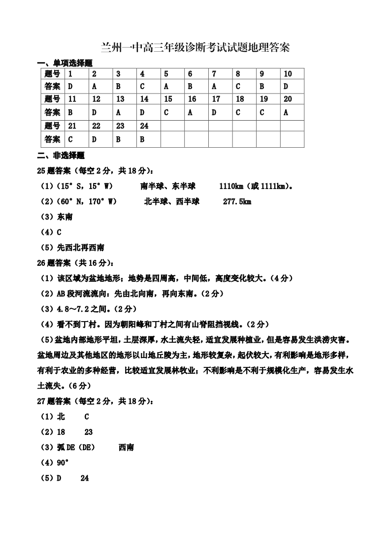 甘肃省兰州第一中学2025届高三年级诊断考试试卷地理答案