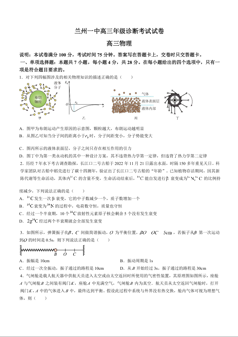 甘肃省兰州第一中学2025届高三年级诊断考试试卷物理+答案