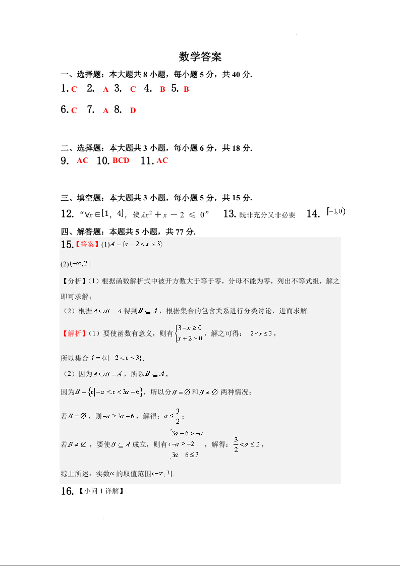 甘肃省武威市凉州区2024-2025学年高三第一次质量检测考试数学答案