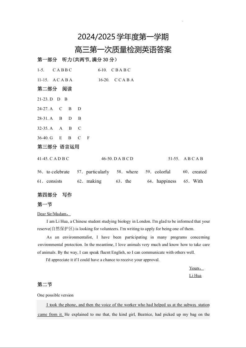 甘肃省武威市凉州区2024-2025学年高三第一次质量检测考试英语答案