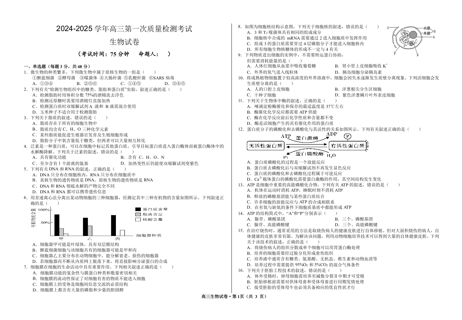 甘肃省武威市凉州区2024-2025学年高三第一次质量检测考试生物