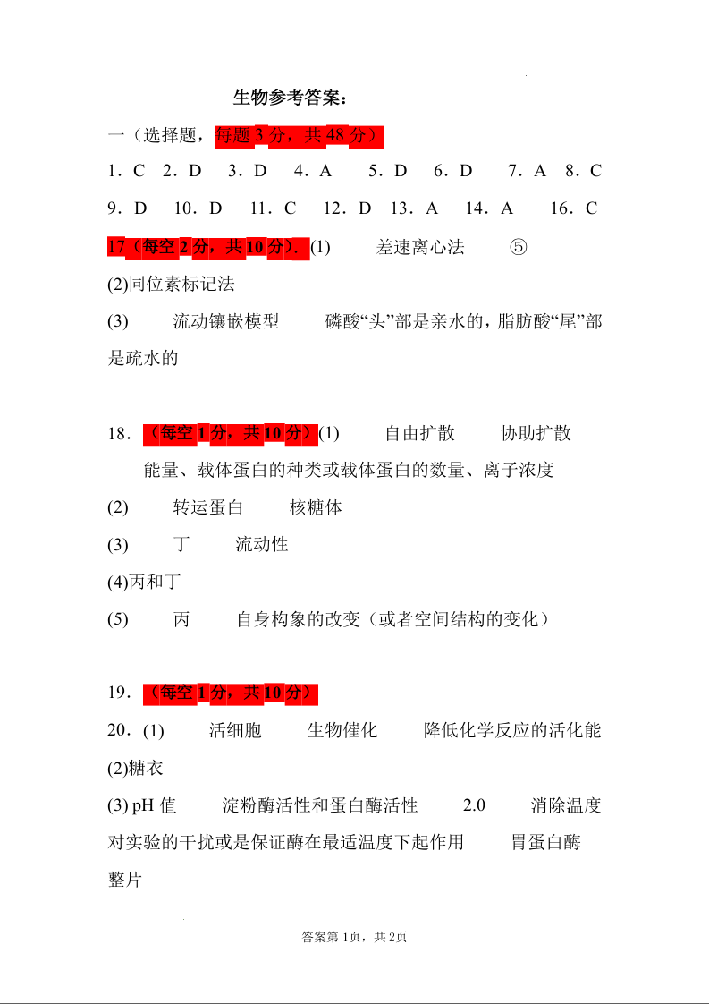 甘肃省武威市凉州区2024-2025学年高三第一次质量检测考试生物答案