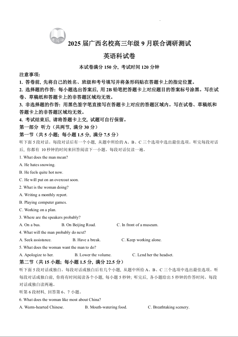 广西名校2025届高三年级9月联合调研测试英语+答案