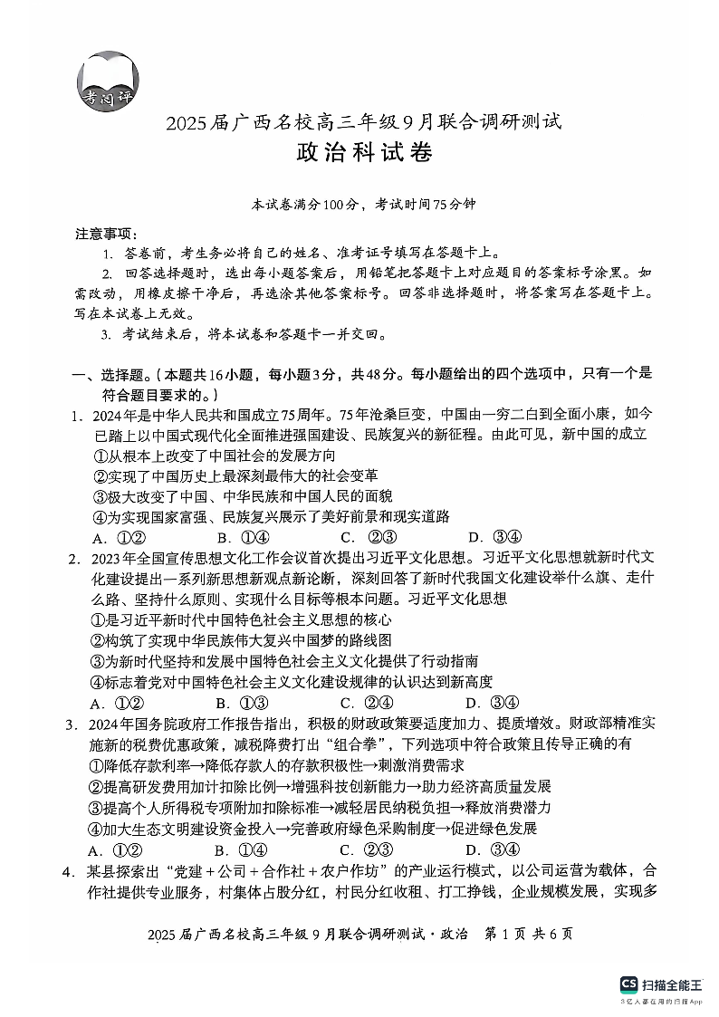 广西名校2025届高三年级9月联合调研测试政治