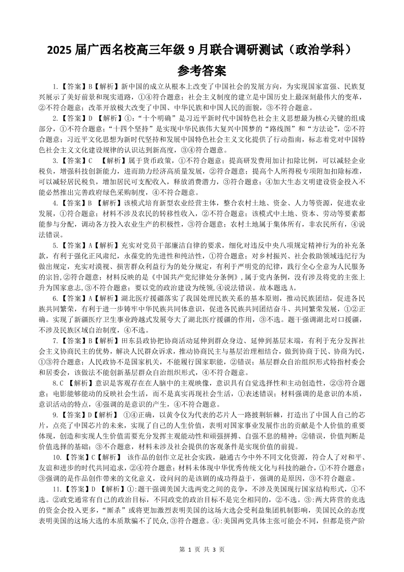 广西名校2025届高三年级9月联合调研测试政治答案