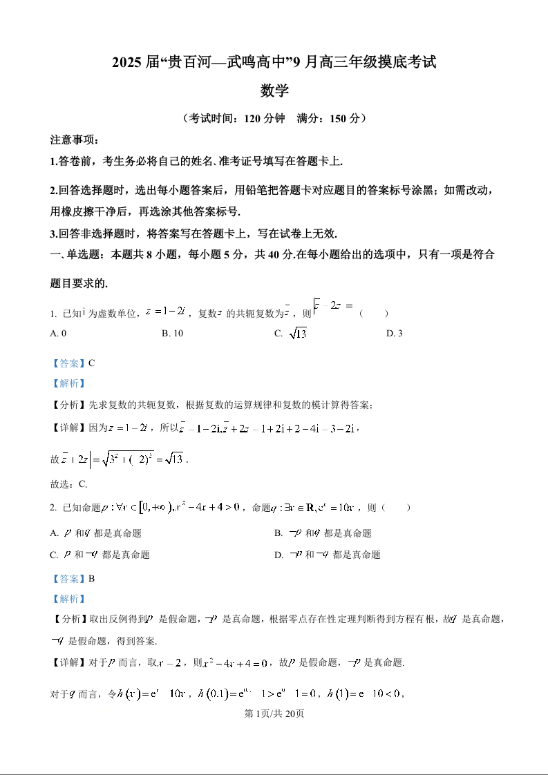 广西省“贵百河—武鸣高中”2025届高三上学期9月摸底考试数学试题(解析版)