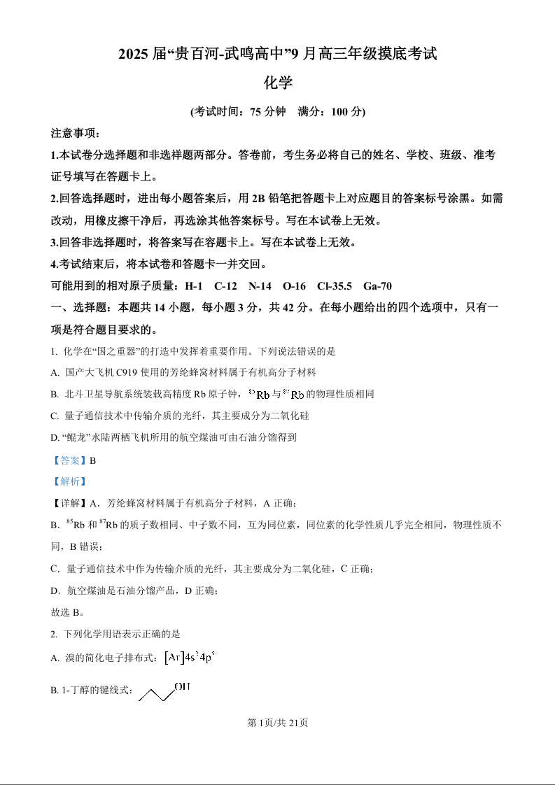 广西省“贵百河—武鸣高中”2025届高三上学期9月摸底考试化学试题(解析版)