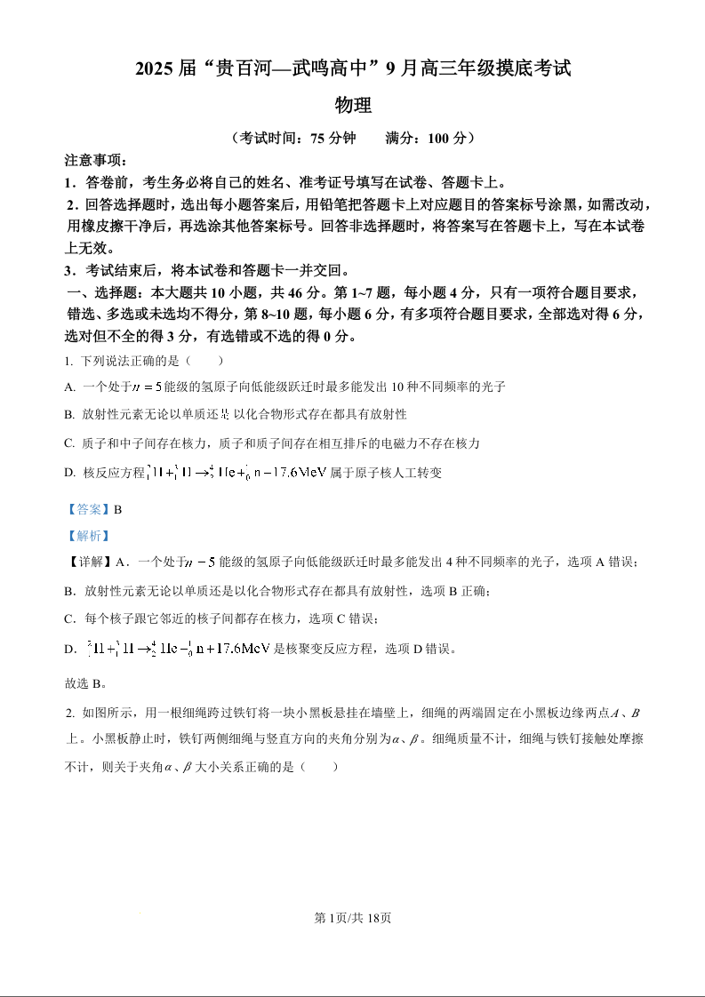 广西省“贵百河—武鸣高中”2025届高三上学期9月摸底考试物理试题(解析版)