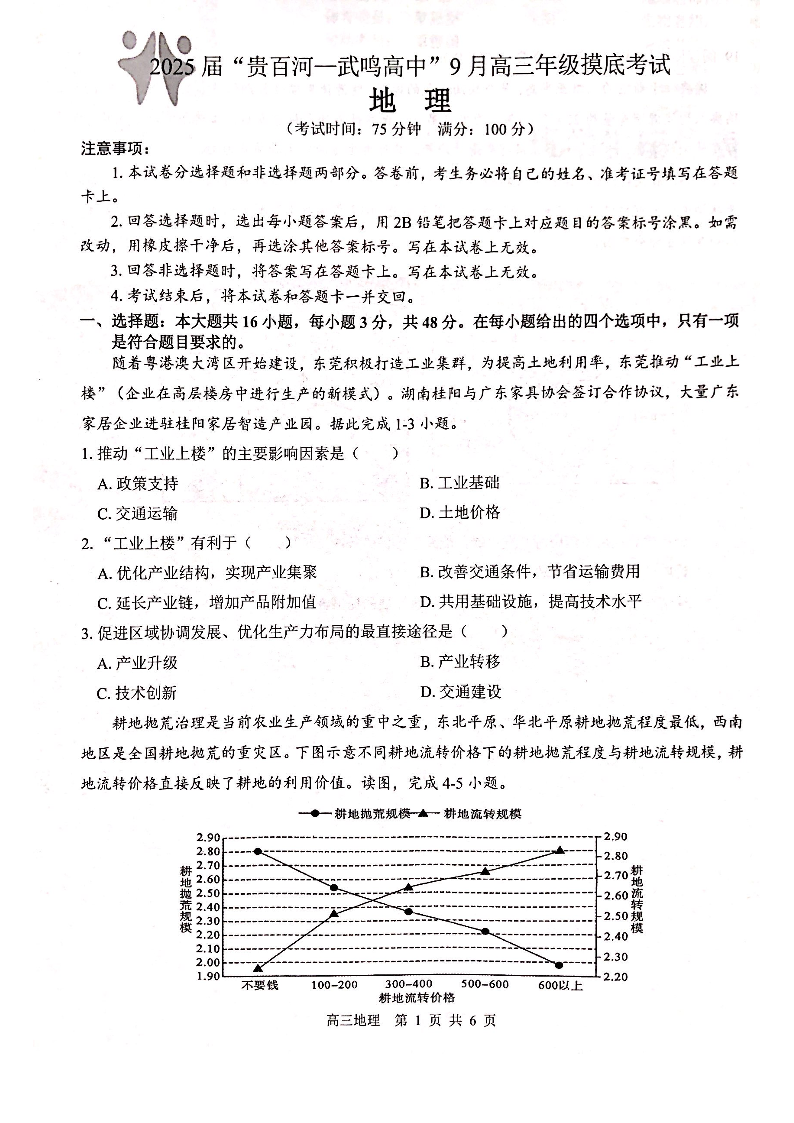 广西省“贵百河—武鸣高中”2025届高三上学期9月摸底考试地理