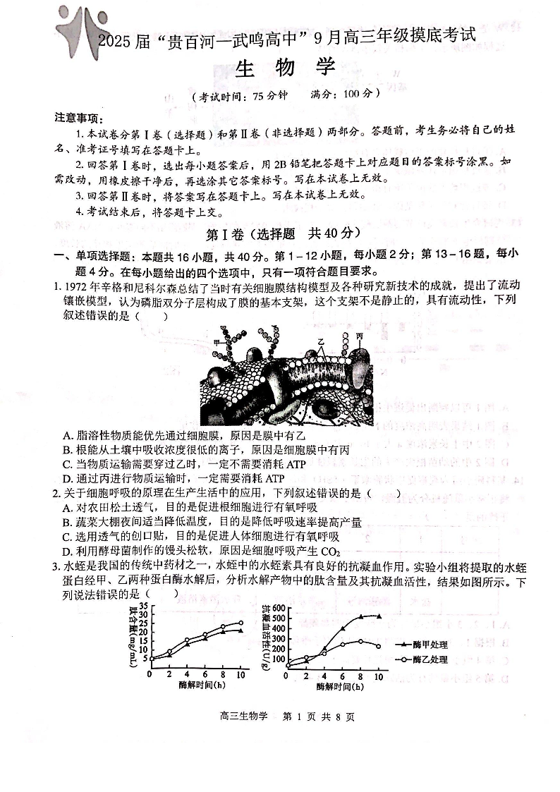 广西省“贵百河—武鸣高中”2025届高三上学期9月摸底考试生物