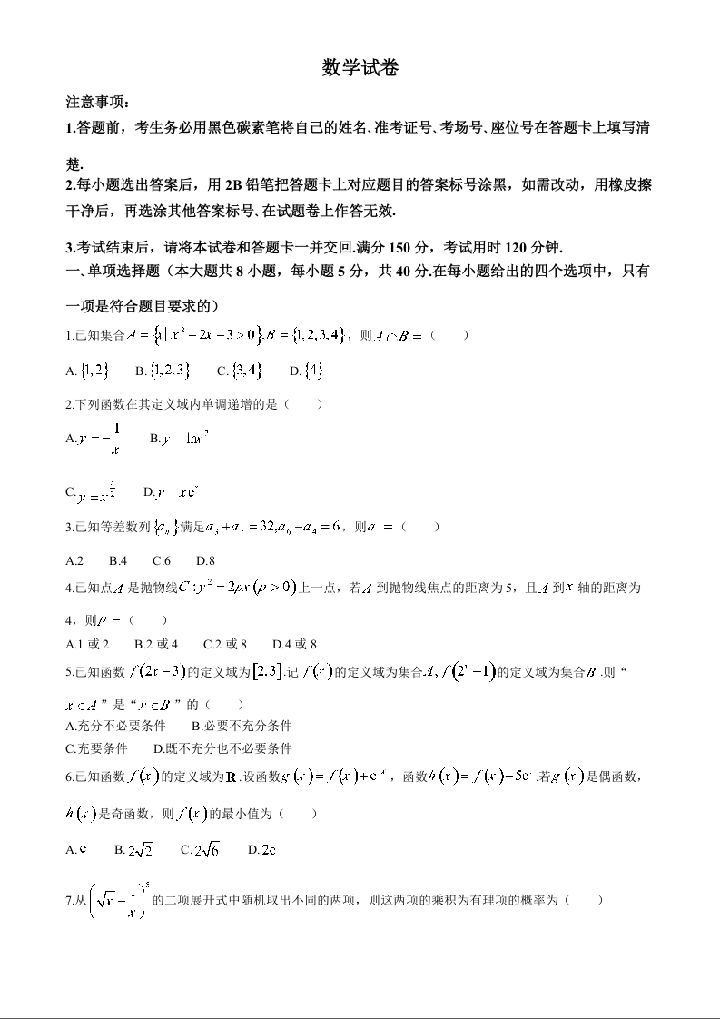 贵州省贵阳市第一中学2025届高三上学期适应性月考(一)数学试卷+答案