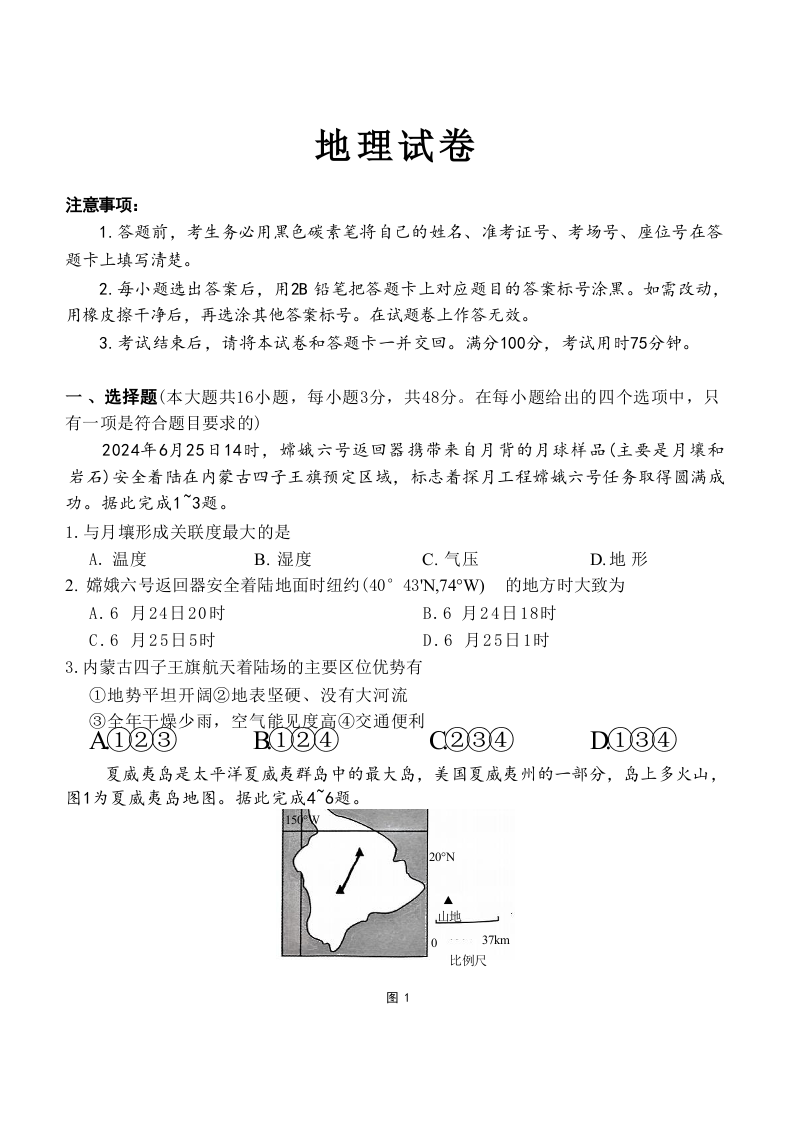贵州省贵阳市第一中学2025届高三上学期适应性月考(一)地理+答案