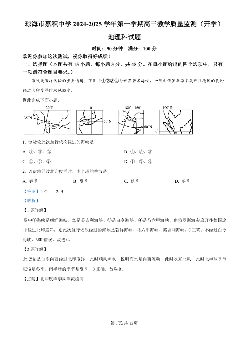 海南省琼海市嘉积中学2024-2025学年第一学期高三教学质量检测地理试题(解析版)