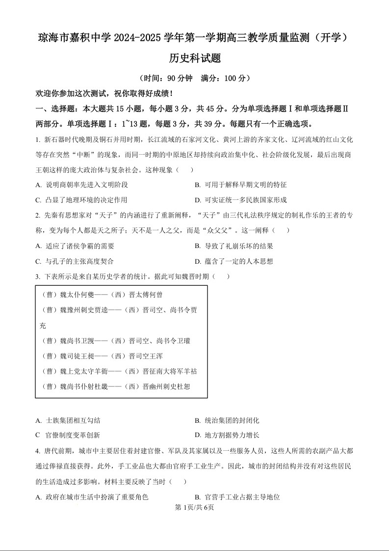 海南省琼海市嘉积中学2024-2025学年第一学期高三教学质量检测(原卷版)