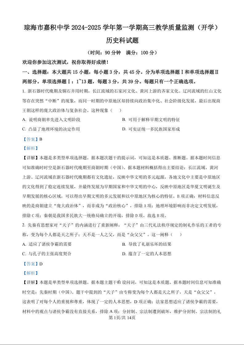 海南省琼海市嘉积中学2024-2025学年第一学期高三教学质量检测(解析版)