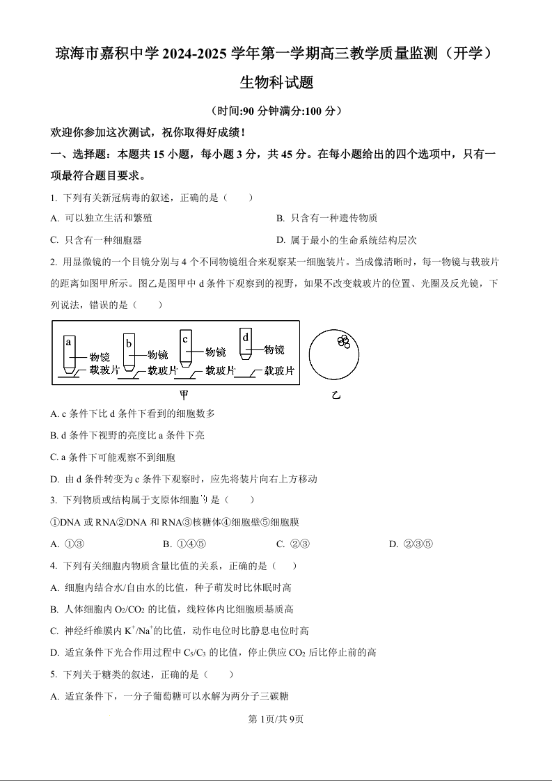 海南省琼海市嘉积中学2024-2025学年第一学期高三教学质量检测生物试题(原卷版)