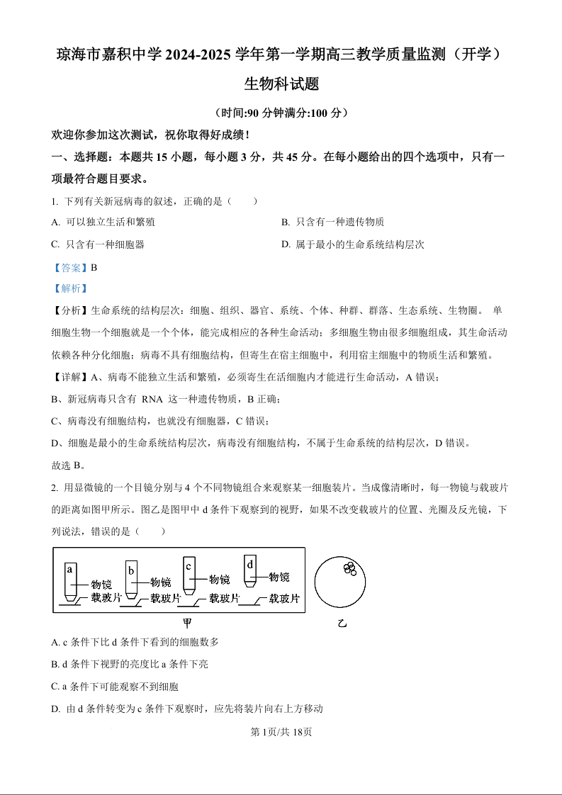 海南省琼海市嘉积中学2024-2025学年第一学期高三教学质量检测生物试题(解析版)