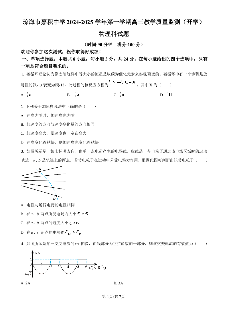 海南省琼海市嘉积中学2024-2025学年第一学期高三教学质量检测物理试题(原卷版)