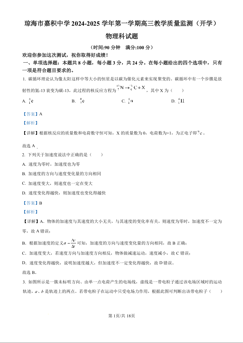 海南省琼海市嘉积中学2024-2025学年第一学期高三教学质量检测物理试题(解析版)