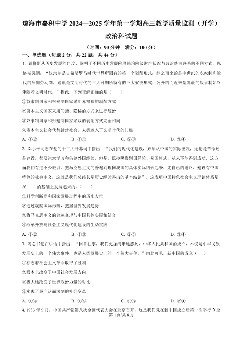 海南省琼海市嘉积中学2024-2025学年第一学期高三教学质量检测政治试题(原卷版)